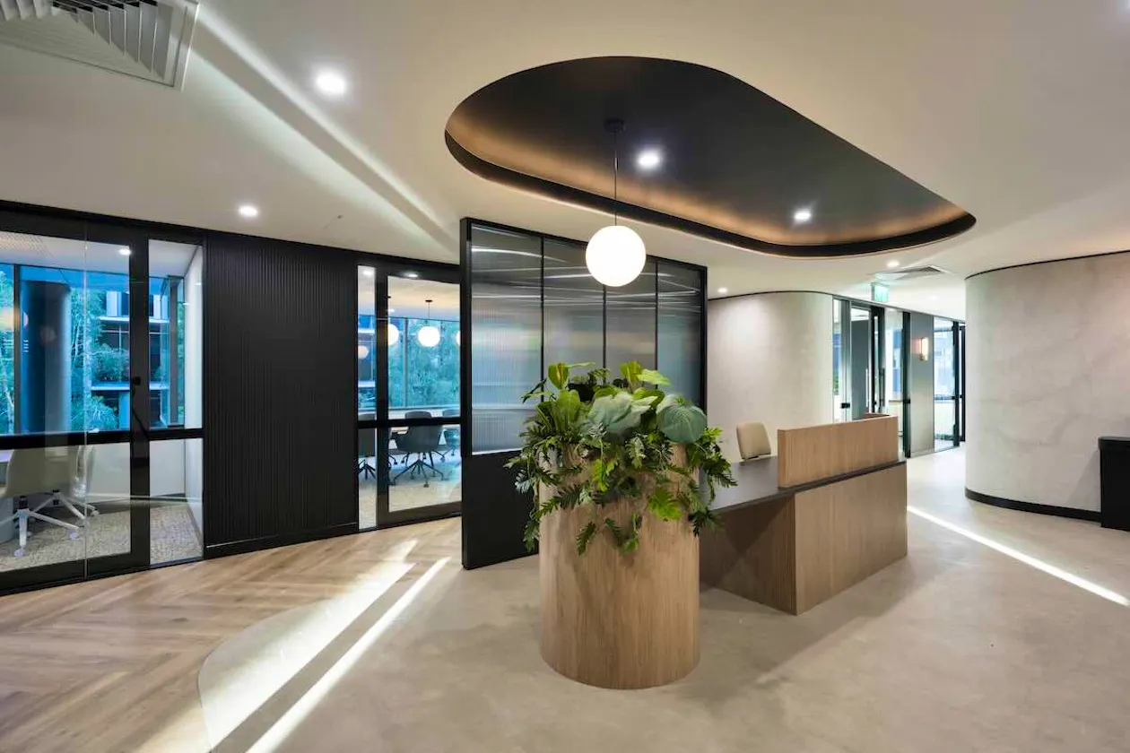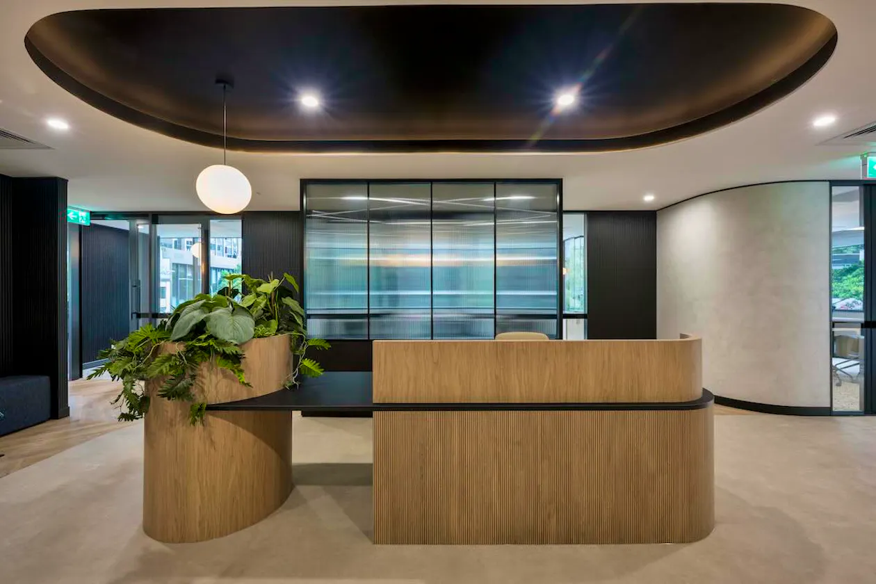 A custom reception counter becomes the centrepiece of the entry experience, featuring fluted glazing panels, a curved laminate base and integrated planter boxes. A recessed ceiling painted in black with a surrounding LED light strip gives the entry zone a dramatic, considered quality that sets the tone for the rest of the floor. Three-dimensional wall panelling at the rear of the reception tied back to the front counter detail, creating an immediate sense of visual continuity and design intent.