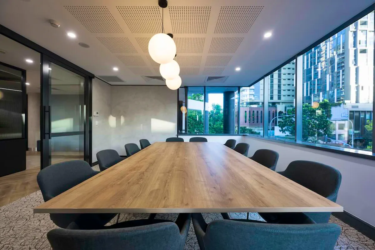 The acoustic panelling used across the reception and boardroom resolved the practical need for sound management while functioning as a feature element that elevates the visual quality of the space, an approach that adds perceived value for prospective tenants without a disproportionate cost implication.