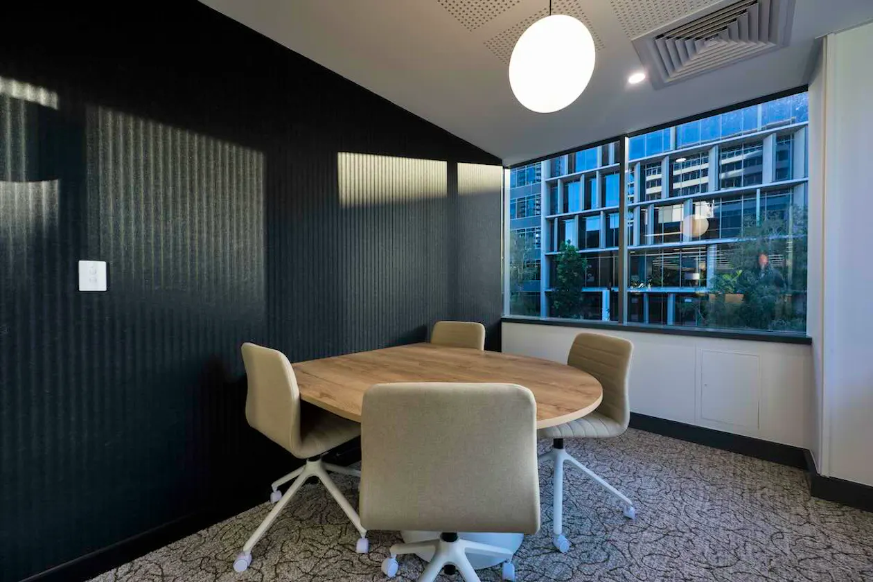 The boardroom features a detailed ceiling treatment, bold feature paint and complementary carpet. Three-dimensional acoustic panelling was introduced as both a practical and aesthetic element, echoing the reception detail and reinforcing design coherence across the floor. Brass door handle hardware was carried consistently throughout all rooms, adding a premium finishing touch that prospective tenants will notice.