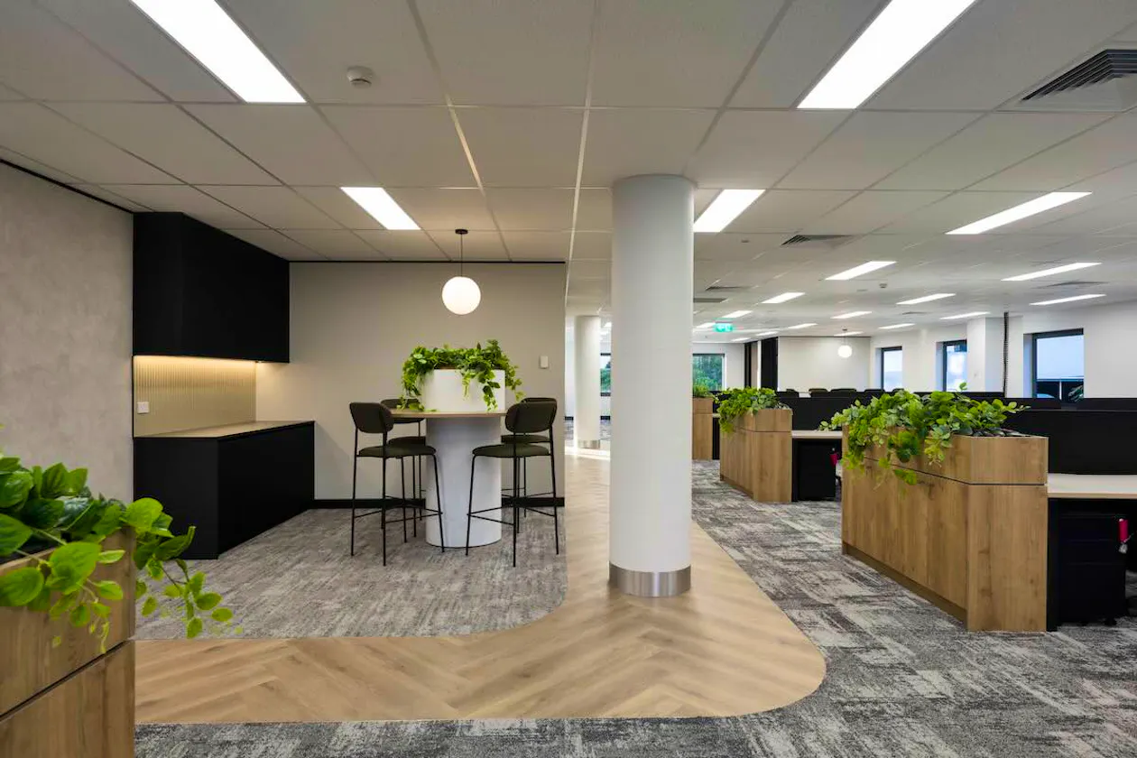 The open plan zones were designed to feel energising and flexible, demonstrating the full potential of the floor plate to prospective tenants. Herringbone vinyl continued through the main walkways with textured carpet defining work areas. Low-profile planter boxes subtly delineated zones without closing off the space. Collaboration areas featured pops of colour through feature stools and carpet insets, while a high bar zone offered a further flexible setting that speaks to modern, activity-based working preferences.